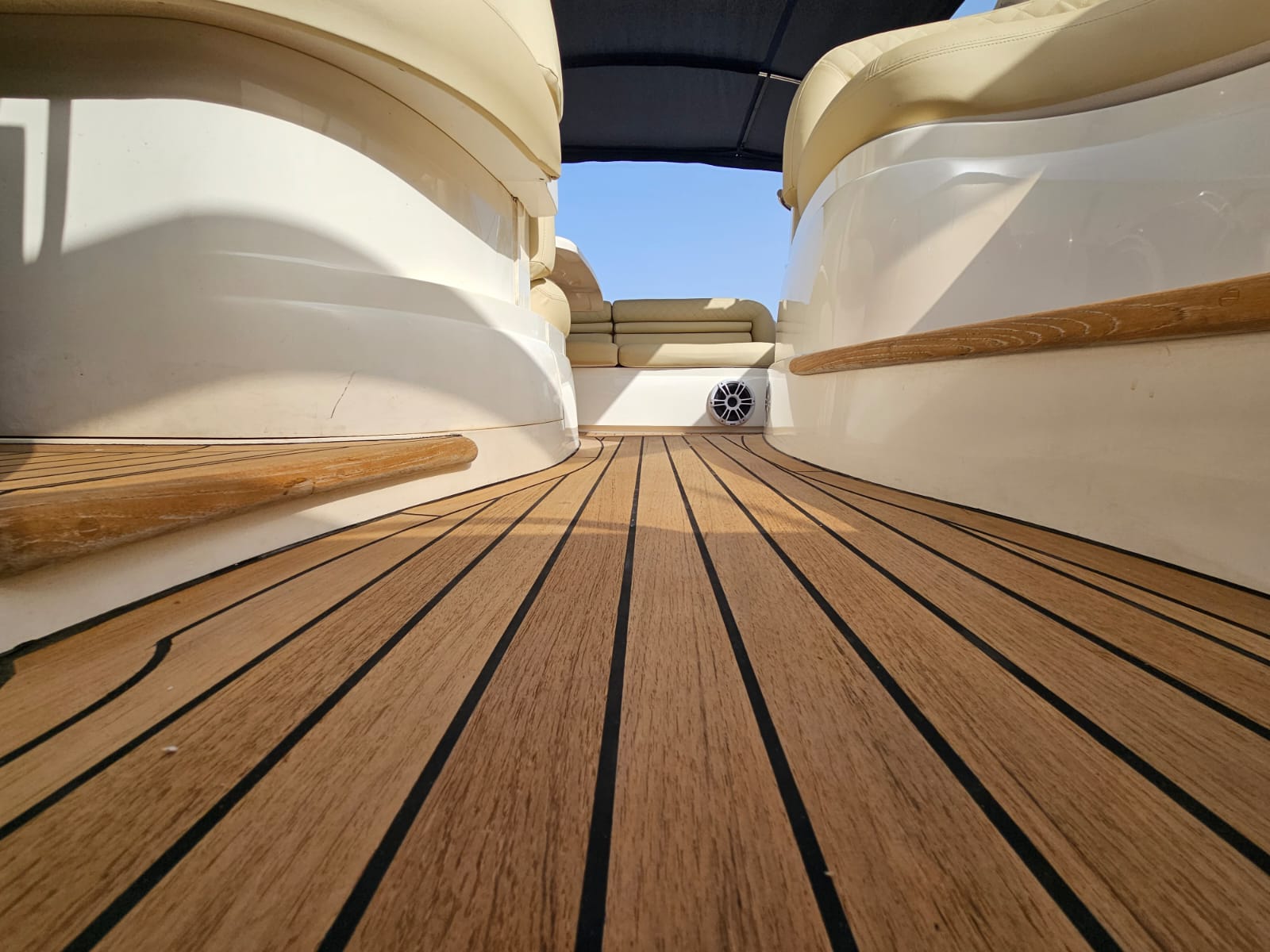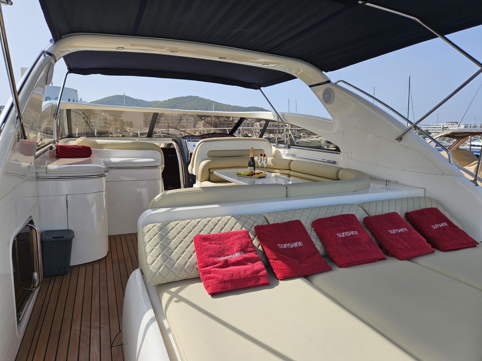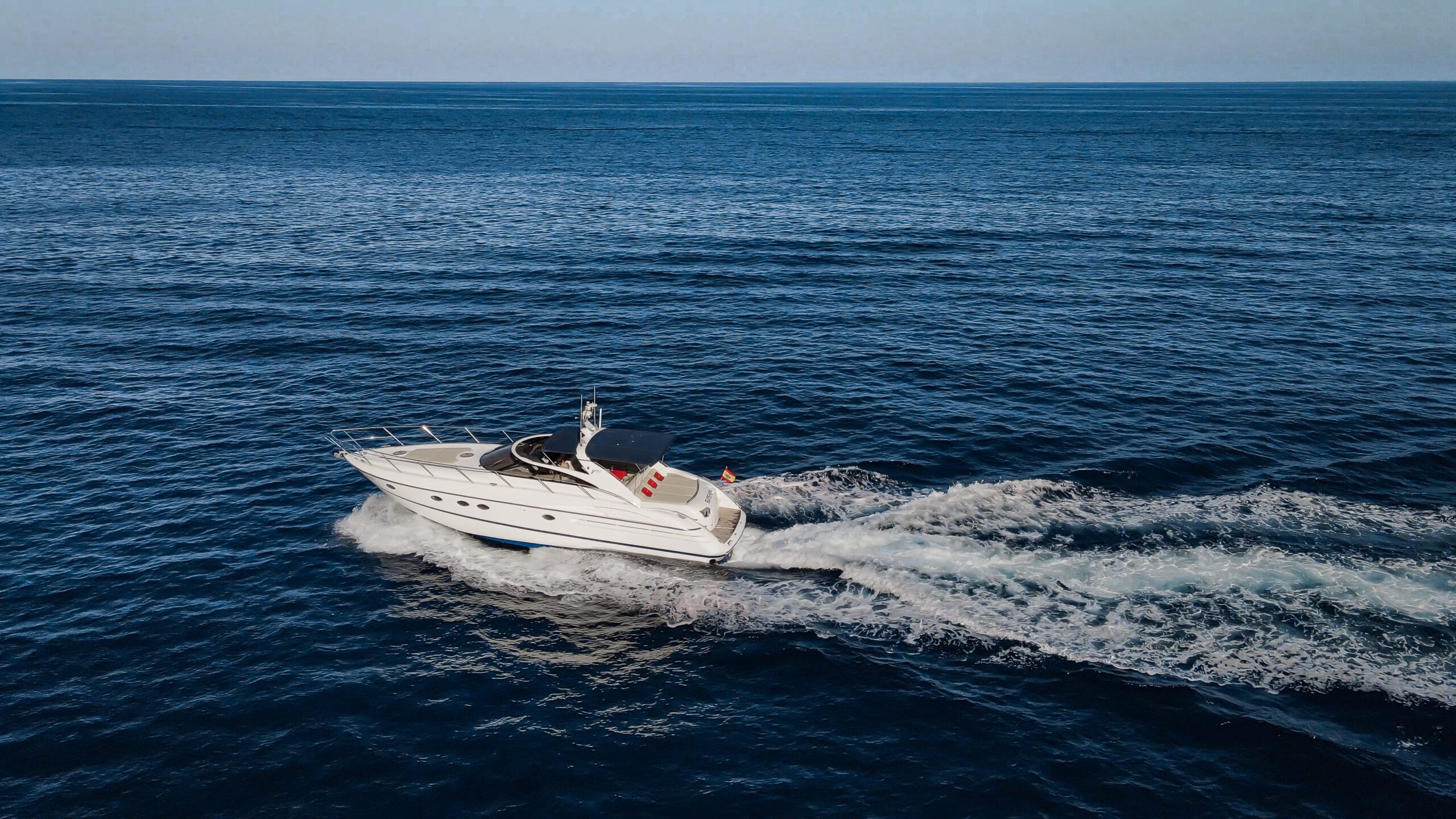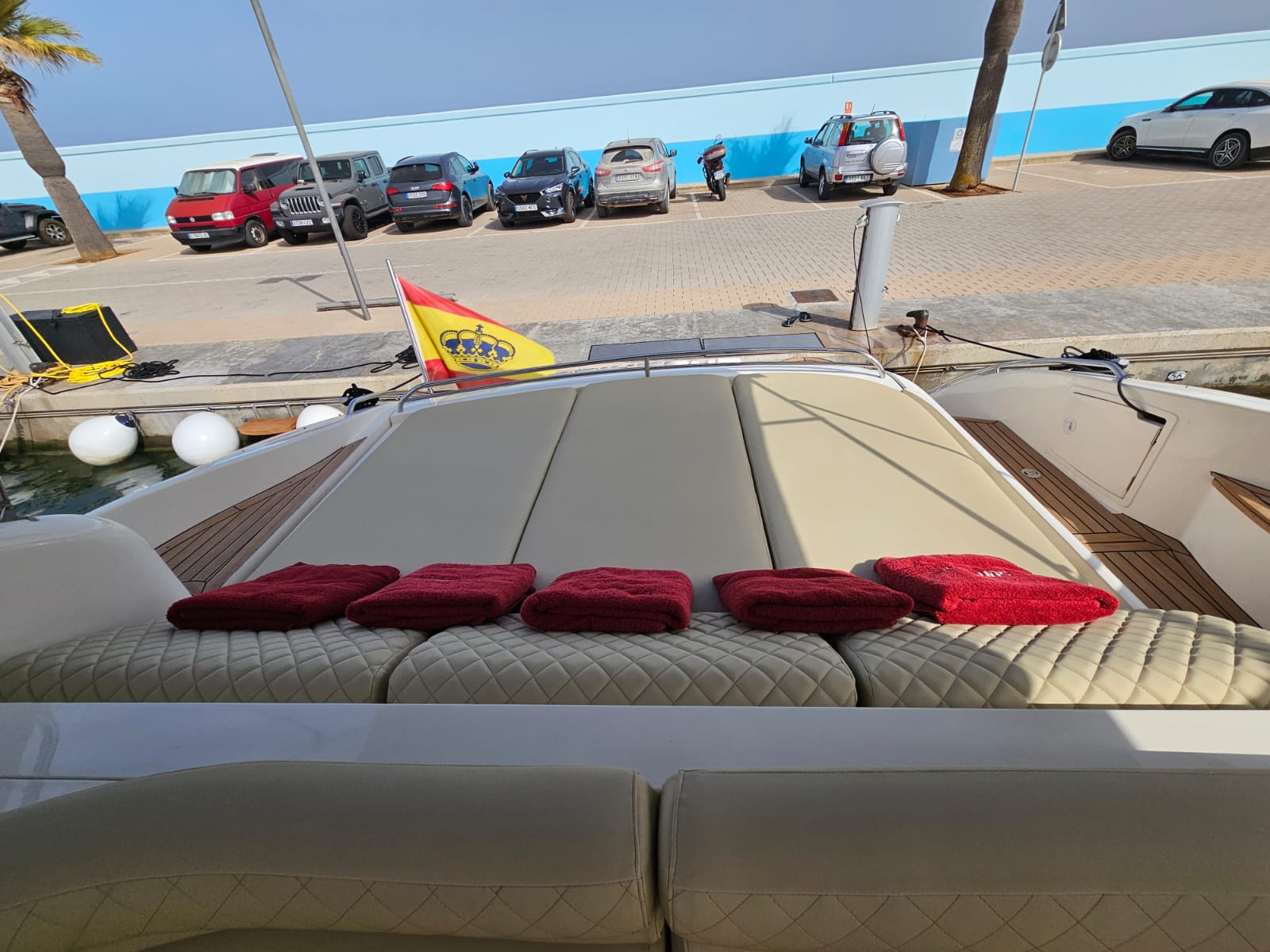 Impulsado por dos potentes motores Volvo de 700 HP, el V50 garantiza una navegación suave, estable y llena de sensaciones. Es el barco perfecto tanto para desplazamientos rápidos entre calas como para disfrutar de un fondeo relajado en las aguas turquesas de Ibiza y Formentera. Su distribución exterior, con líneas envolventes y zonas abiertas muy bien conectadas, invita a disfrutar del mar desde cualquier punto de la embarcación.